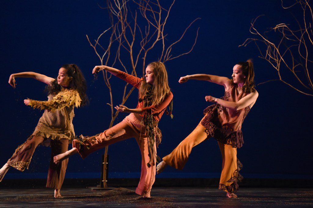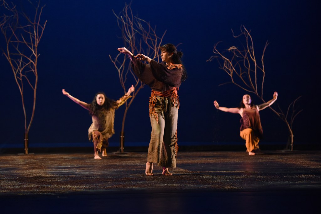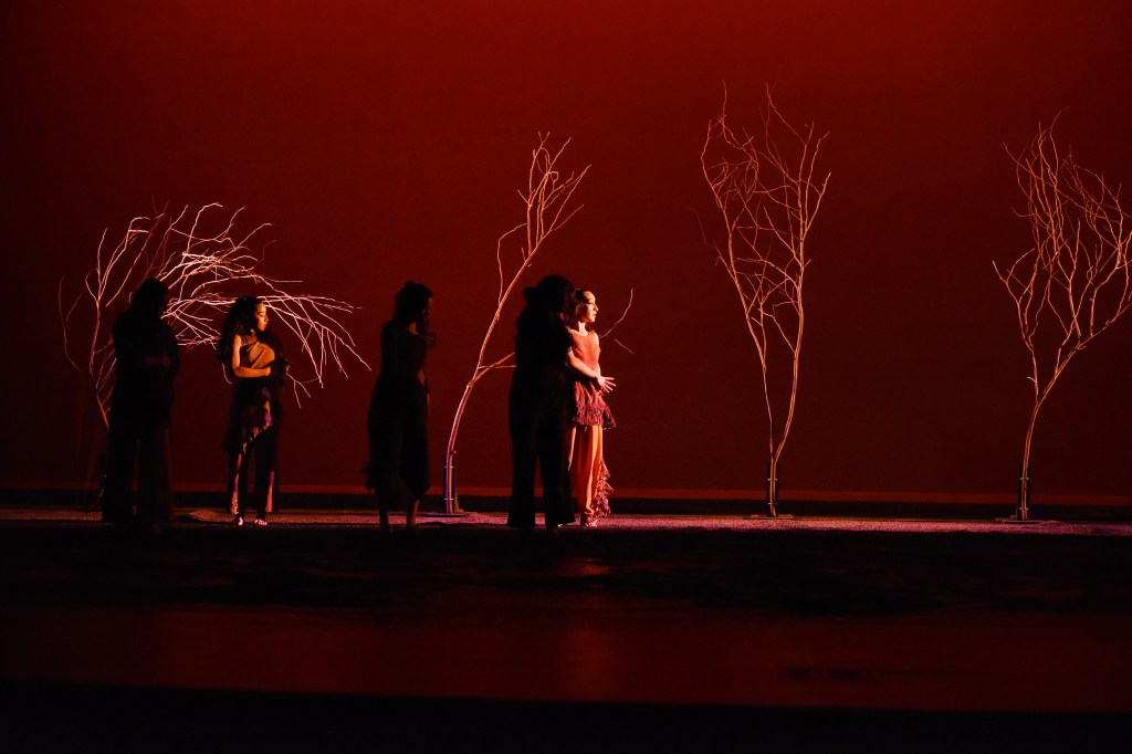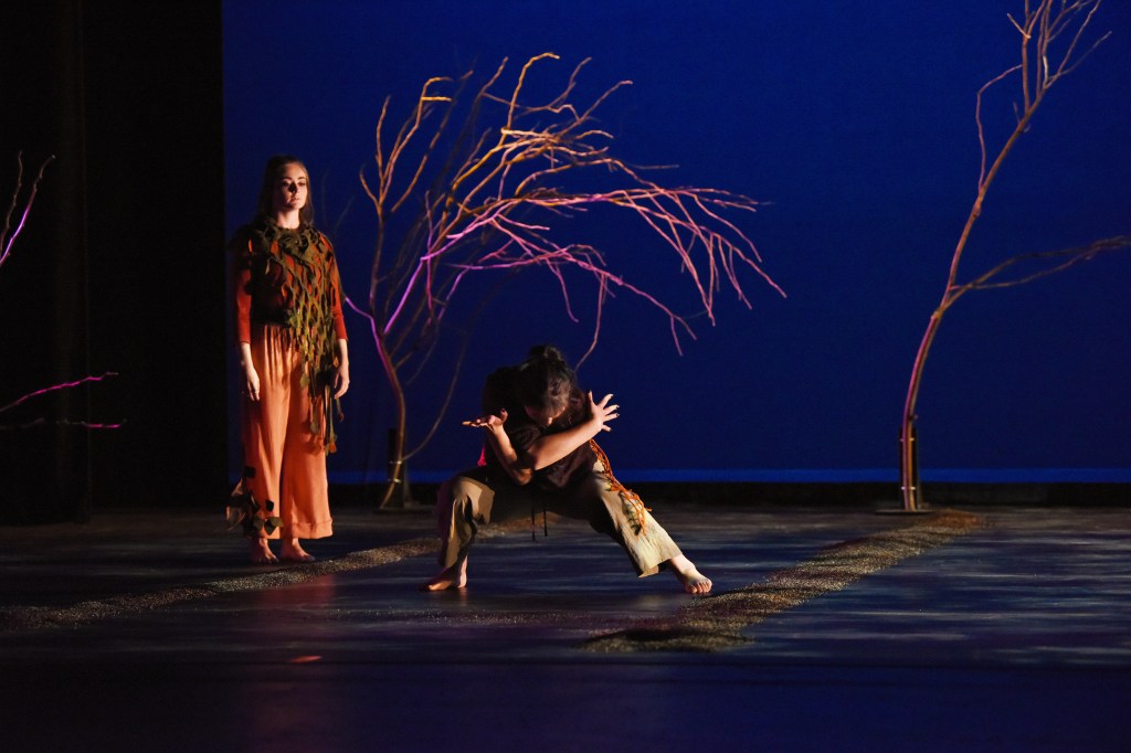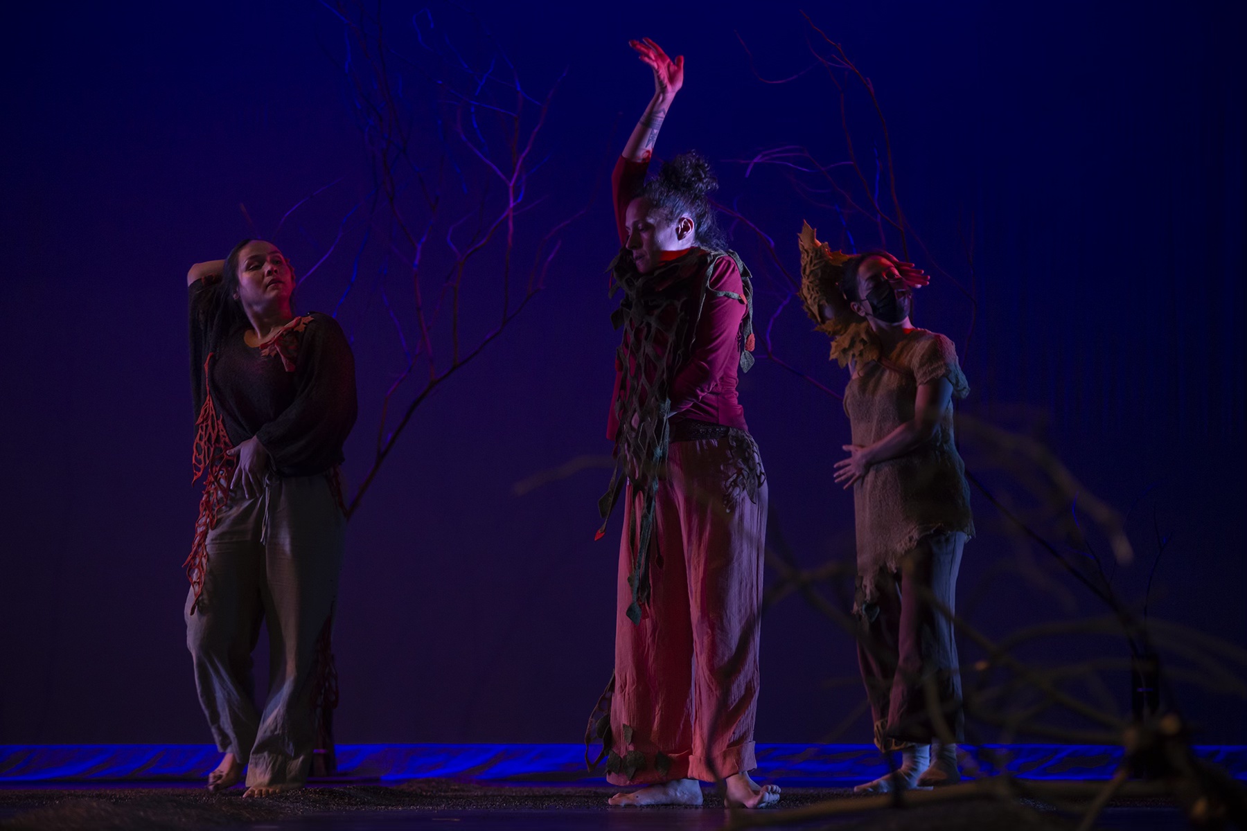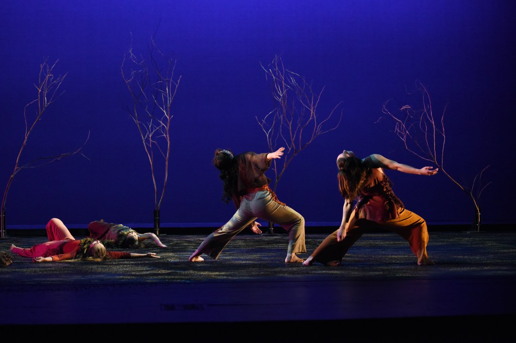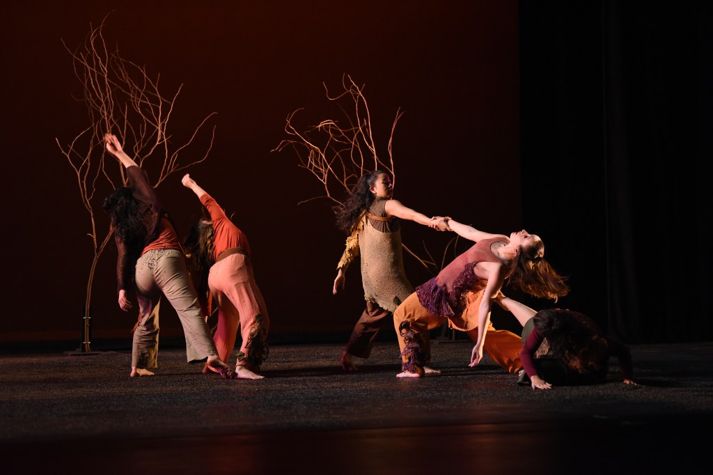 Below: Performance of Haikeus: Field II. Dancers (ASU Cast): Imani Etter, Monique Kelley, Maddie Lasco, Alex Solano, and Suzanna Varela. Photos: Tim Trumble. Lighting Design: Carolyn Koch. Costumes: Cari Smith.