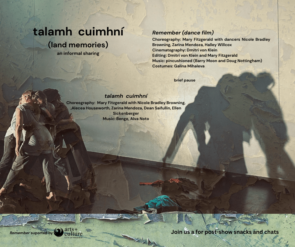 talam cuimhní is a work-in-process that began with reflections on my Irish grandmother’s life and my connection to the wild and gentle spirit of the landscapes, people, and culture of Ireland. My grandmother, Hannah Hurley, came to the US in the early 20th century, but we know little of her life in Ireland or her journey to this country. Though she died when I was 6 yrs. old, I have many questions, many dreams, and some haunting memories of her presence. This work explores some of those questions through persistent images, body memories, and the deep sense of home I feel in the Irish landscape. The dancers also have brought their own experiences to the creation of the choreography; I am grateful for their generosity in sharing such rich and personal material.